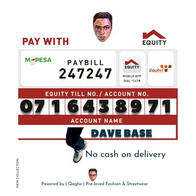 M-PESA: Lipa Na M-PESA >Paybill no > 247247 > Business no 0716438971 Enter amount + Shipping Cost Ksh 300 within Nairobi Environ, Other Towns Ksh 600 and complete the transaction using your M-PESA PIN. Account name Dave Base both Equity Bank/M-PESA message confirmation will pop up back to you. NB/ make payments before you confirm the order & no Cash on Delivery
